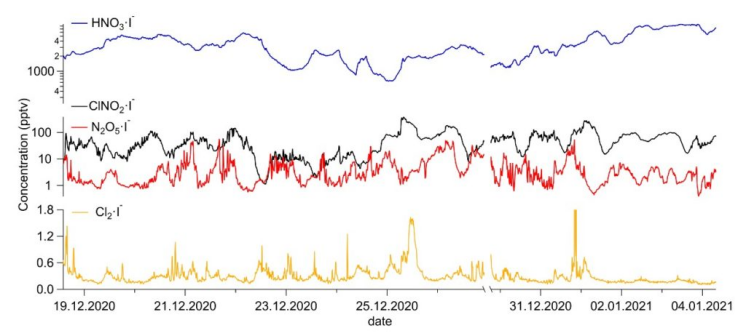 图 1. 碘离子Vocus Aim 观测到的特征无机化合物在瑞士山区冬季15天内的浓度变化.