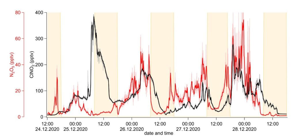 图 2. 12月25日白天至28号之间的典型氯活化过程:在N2O5峰值后都会跟随着一个ClNO2的峰值。浅色线条表示1Hz的碘离子Vocus Aim观测数据;深色线条则是10分钟的平均值。黄色背景区对应日间光照时间段。