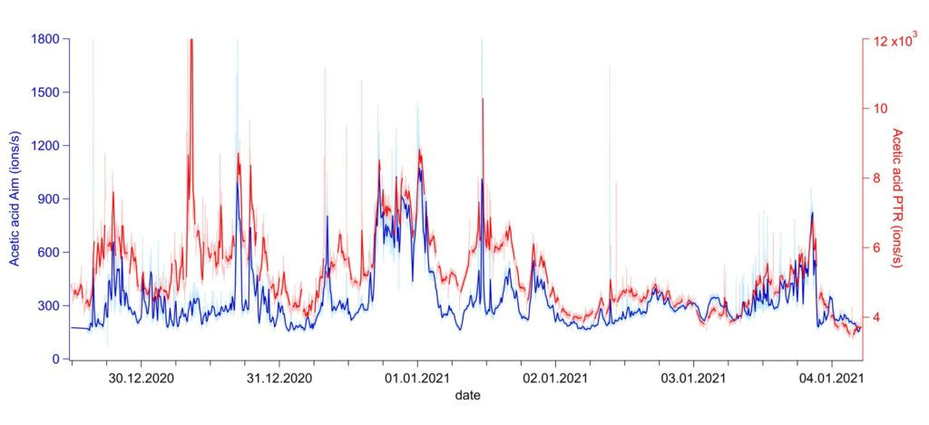 通过与Vocus PTR结果的相互比较,验证了配有Aim反应器的Vocus CI-TOF在这几周无人值守观测周期中的绝佳稳定性。分子式为C2H4O2的物种在两台仪器上呈现出几乎相同的浓度时间序列(图6)。Vocus PTR(红线)测量的是乙酸和羟乙醛的总和,而Vocus Aim I-(蓝线)则相对更有选择性,测量的结果只来源于乙酸[9]。值得注意的是,上述两台仪器的响应对大气样品中的湿度不敏感,所以我们无需对数据进行湿度修正,大大简化了数据分析流程也同时提高了数据质量。
