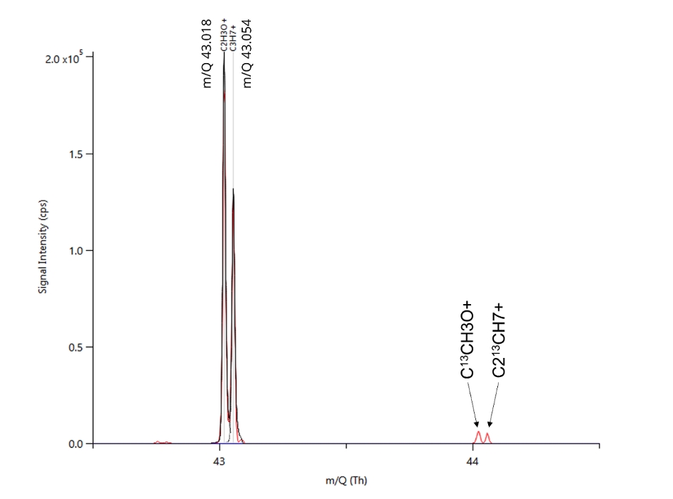 图1. 质子化丙烯分子峰(m/Q 43.054)在Vocus CI-TOF谱图上的响应以及相对应的同位素峰