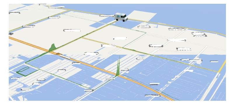 图4. Vocus CI-TOF质谱仪在某工业园区内丙烯走航监测浓度分布图。绿色线条高度越高,意味着该点位丙烯浓度越高。