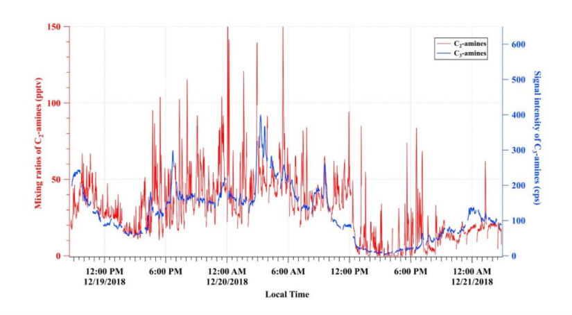 有机胺作为挥发性气体,基于酸碱成核机理,在新粒子生成、成长和二次气溶胶的形成过程中起着重要的作用。大气中有机胺来源非常广泛,如工业排放、畜牧业、海洋有机物降解、生物质燃烧等。然而,目前能有效检测胺类的观测手段相对缺乏,气相色谱和离子色谱技术在时间分辨率上不足,难以获取胺类物质在大气中的实时变化;其他一些分析手段的检测限不能满足捕捉到大气中数十个pptV级别浓度的胺类物质;此外,胺类本身具有的‘黏’性对分析仪器的进样管设计和设备自身的响应时间都提出了挑战。来自Tofwerk的Vocus PTR-TOF克服了上述难点,相应调整参数后,在保障对大部分VOCs测量的同时,也能捕获大气中单个pptV级别的有机胺类。