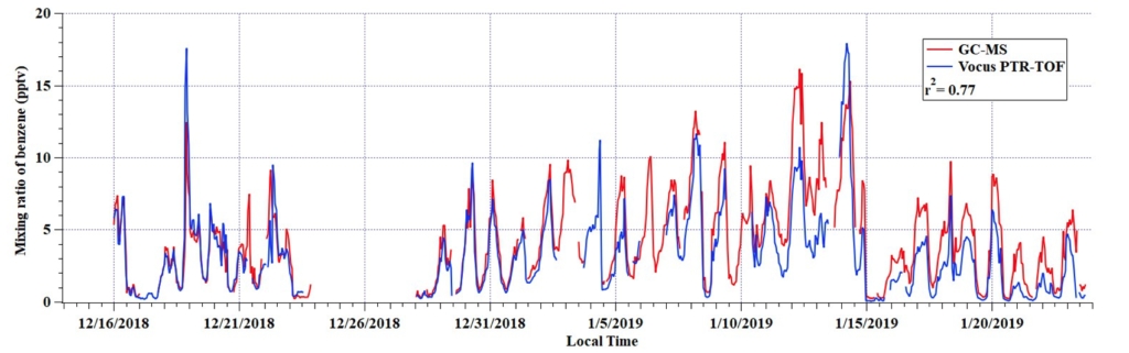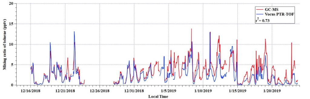 在望都的观测过程中,Vocus PTR-TOF清晰的捕捉到了C2-胺(二甲胺和乙胺总和)的日变化,这表明这些C2-胺非常活跃的参与了某些大气化学过程。同时,王琳老师课题组也利用离线GC-MS分析了观测期间的苏玛罐气样,随后与Vocus 2R PTR-TOF的在线观测结果进行了仔细比较。就苯和甲苯的结果来看,二种测量手段的时序变化具有非常好的一致性。更多因子的对比结果也会在后续文章中予以总结和讨论,让我们拭目以待。此外,该项目组正致力利用Vocus 2R PTR-TOF来拓展所测的大气有机胺类清单,以期对大气中新粒子生成过程和机理达到更加深入的理解和认知。