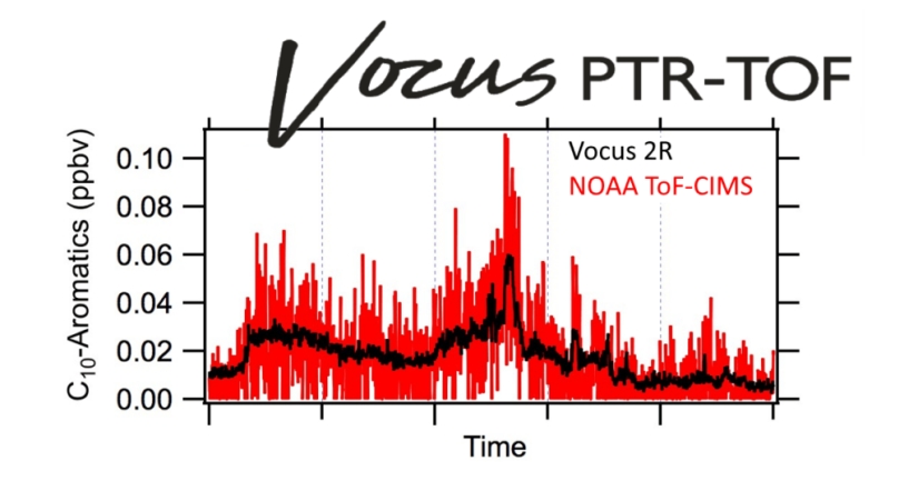 Other key experiments in this work characterize the humidity dependence of the Vocus PTR-TOF and the instrument response time.  In contrast to conventional PTR sources, the sensitivity of the Vocus is shown to have no dependence on the humidity of the sampled air.    Instrument response times, which were measured for several ketones, compare favorably with previously published PTR-MS data.