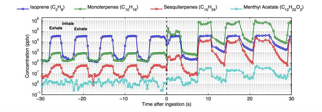 实时监测志愿者在服用润喉片前后的呼出气体中指标性VOCs的变化。Vocus PTR-TOF 2R被用来直接在线分析志愿者的呼出气体。Vocus PTR-TOF是以每秒三张谱图的速度来实时捕捉跟草药成分(比如萜烯和乙酸薄荷酯)和体内代谢(比如异戊二烯)有密切联系的气态指标物的动态变化。被监测的目标物的浓度跨了多达六个数量级(从ppt到ppm)。
