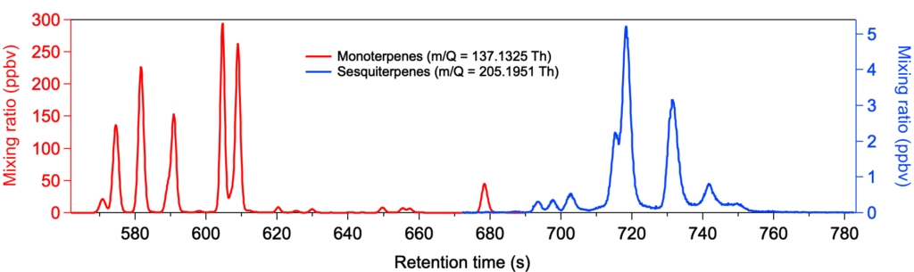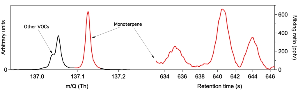 图2. 萜烯和同量异位化合物谱图鉴别。因采用的是快速色谱分离法,精确的定量萜烯(或其他化合物种)还需能分辨出同时洗脱出的同量异位化合物,并根据精确质量来准确的确定物种种类。如图中所示,在保留时间640s时Vocus 2R记录到名义质量137 Th的多个峰,其中只有137.1325的峰是来自于单萜的信号。