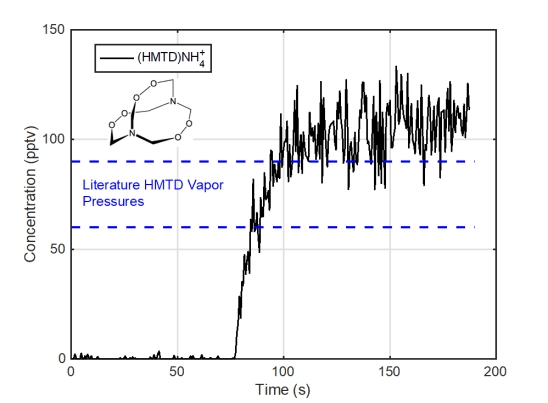 Vocus CI-TOF也能检测挥发性较低的爆炸物。目标检测物的蒸气压是一个重要的参数,其决定了该物质从固态或液态挥发出的饱和气态浓度。对大多数爆炸物来说,Vocus CI-TOF的检测限通常在pptV或ppqV范围。六甲氧胺(HMTD)是一种具有低蒸气压的高爆炸性有机物,这意味其气态浓度相对的低。从另一角度来说,对残留在气态中HMTD的测量,尤其是在大气稀释之后,会很大程度上受到空气中其他物质的干扰。对类似于HMTD这种低挥发性物质的检测通常需要检测仪器具有超高的灵敏度和极好的质量分辨率,才能大海寻‘针’。