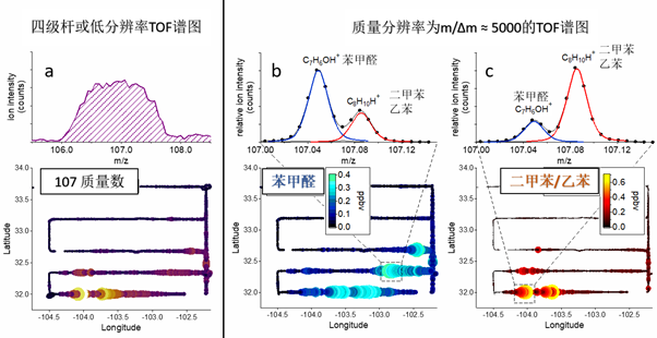Vocus对特定类别的挥发性有机化合物和无机化合物(VOCs和VICs)具有更好的选择性,分析物在电离时产生的碎片有限,因此可以观察到分子离子。上述优点,配合高分辨率飞行时间质谱的强大分辨能力,无需色谱分离也可精确进行复杂混合物成分定性定量分析。